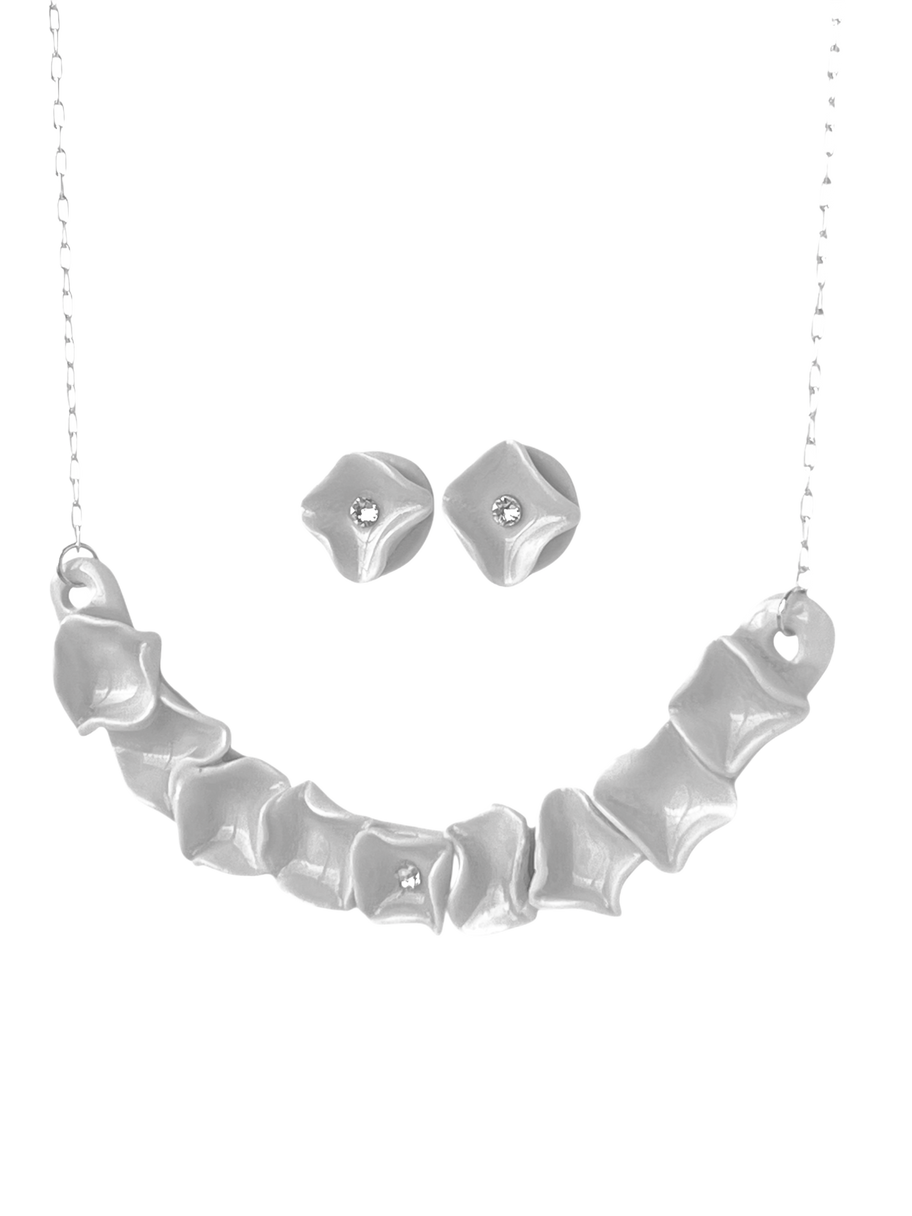 Deslumbra con este moderno conjunto de pendientes y gargantilla blancos brillantes. El esmalte blanco brillante y los cristales estilo Swarovski capturan la luz, añadiendo un toque de glamour a cualquier atuendo. Fornituras y cadena de plata, piedras de cristal.